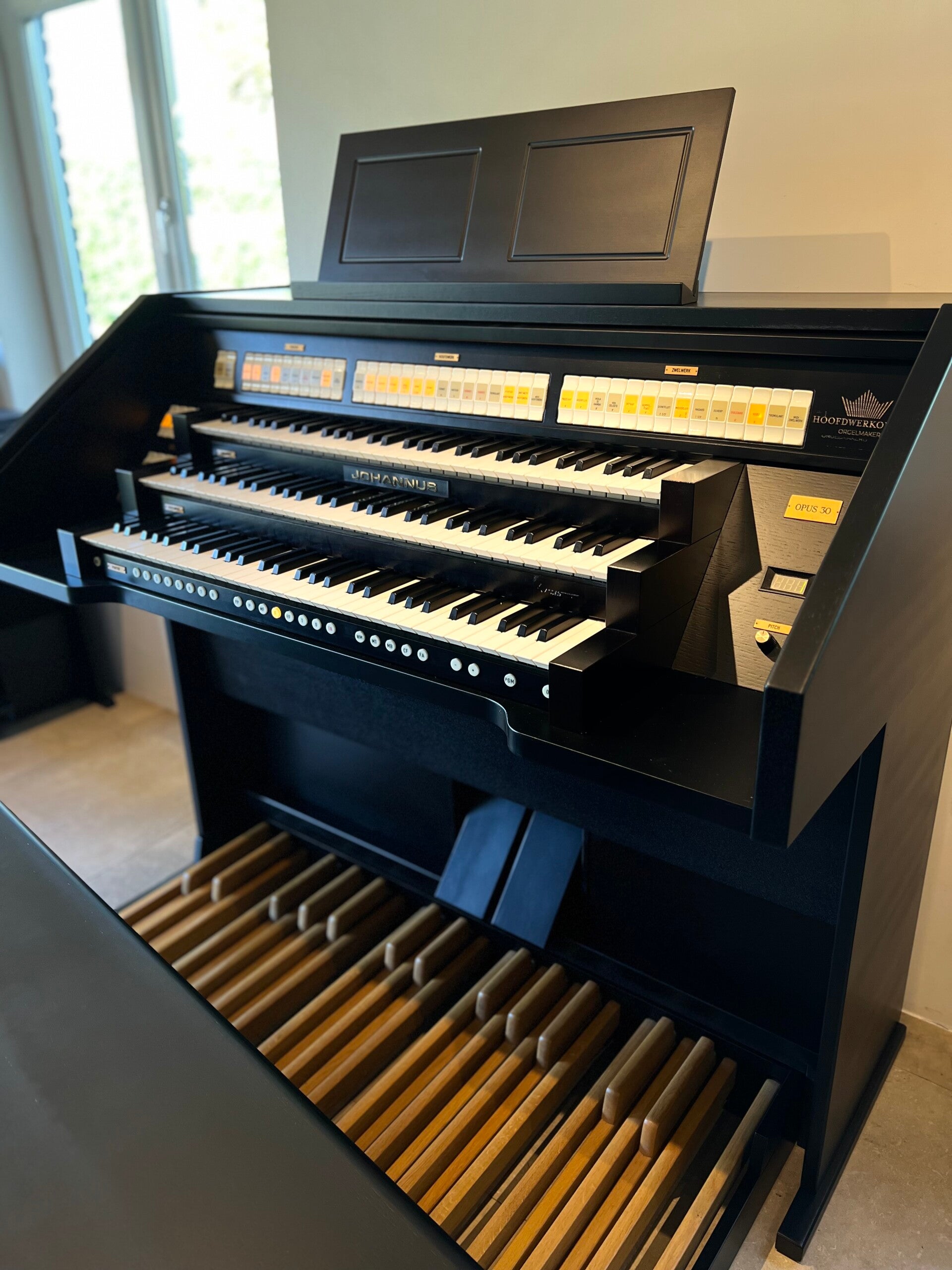 Het drie-klaviers orgel in zwart op eiken uitvoering, met 38 romantische en 38 barok digitaal gesampelde stemmen.